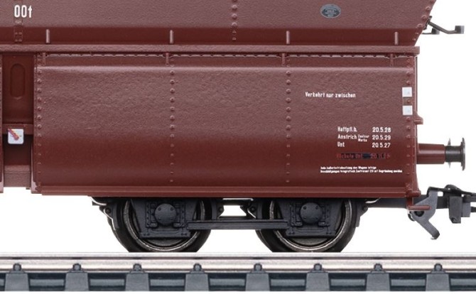 Passend zur neuen E 95 erscheint das Modell des OOt (z) 23 Oldenburg. Dieser Selbstentladewagen wurde von der DRG quasi zeitgleich mit den Lokomotiven der Baureihe E 95 beschafft. Insgesamt wurden zwischen 1928 und 1932 knapp 350 Wagen aus mehreren Bauserien unterschiedlicher Hersteller beschafft. Das mit Kohle beladenen Modell entspricht der ersten Bauserie von Orenstein & Koppel der Nummern 501 bis 590 mit Lenkachsen und Zweiwellenverschlüssen. Die Wagen besitzen im Unterschied zu den bisher erschienenen Wagen der Bauart OOt (z) 41 / 43 einen genieteten Wagenkasten ohne Einpolterungen zum Aufstieg und ein anderes Untergestell. Exklusiv für Märklin Insider erscheint ein Set mit 10 unterschiedlichen Betriebsnummern. Wer noch weitere 10 Wagen an die E 95 hängen möchte, findet diese als Set im TRIX H0 Programm. Auch dieses Set ist exklusiv den TRIX- (oder auch Märklin-) Clubmitgliedern vorbehalten.