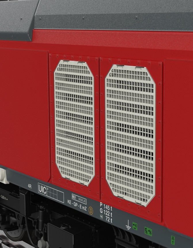 Die Lüftergitter sind fein durchbrochen und die in zweiter Ebene liegenden Lamellen der Lüfter sind separat dargestellt.